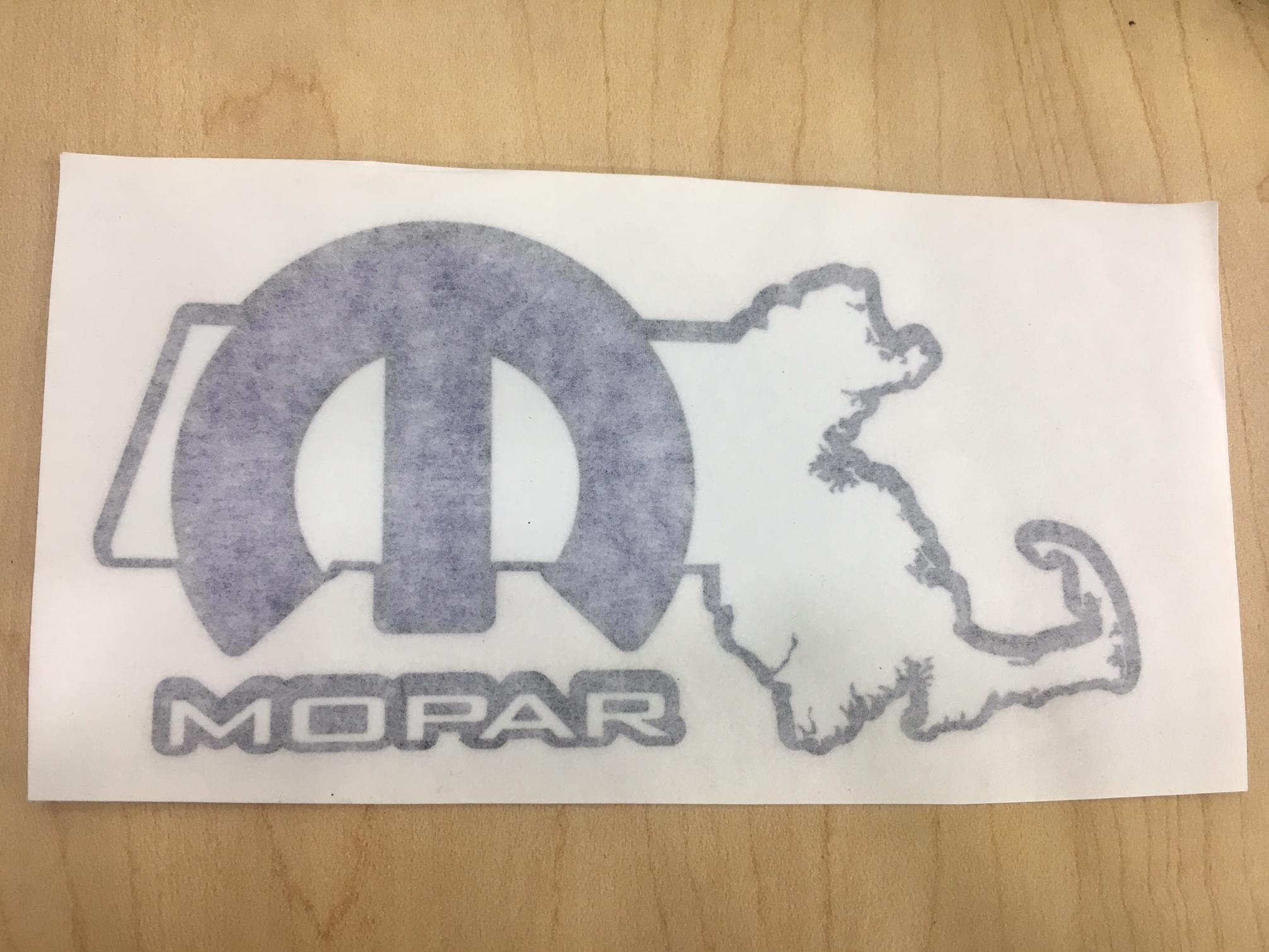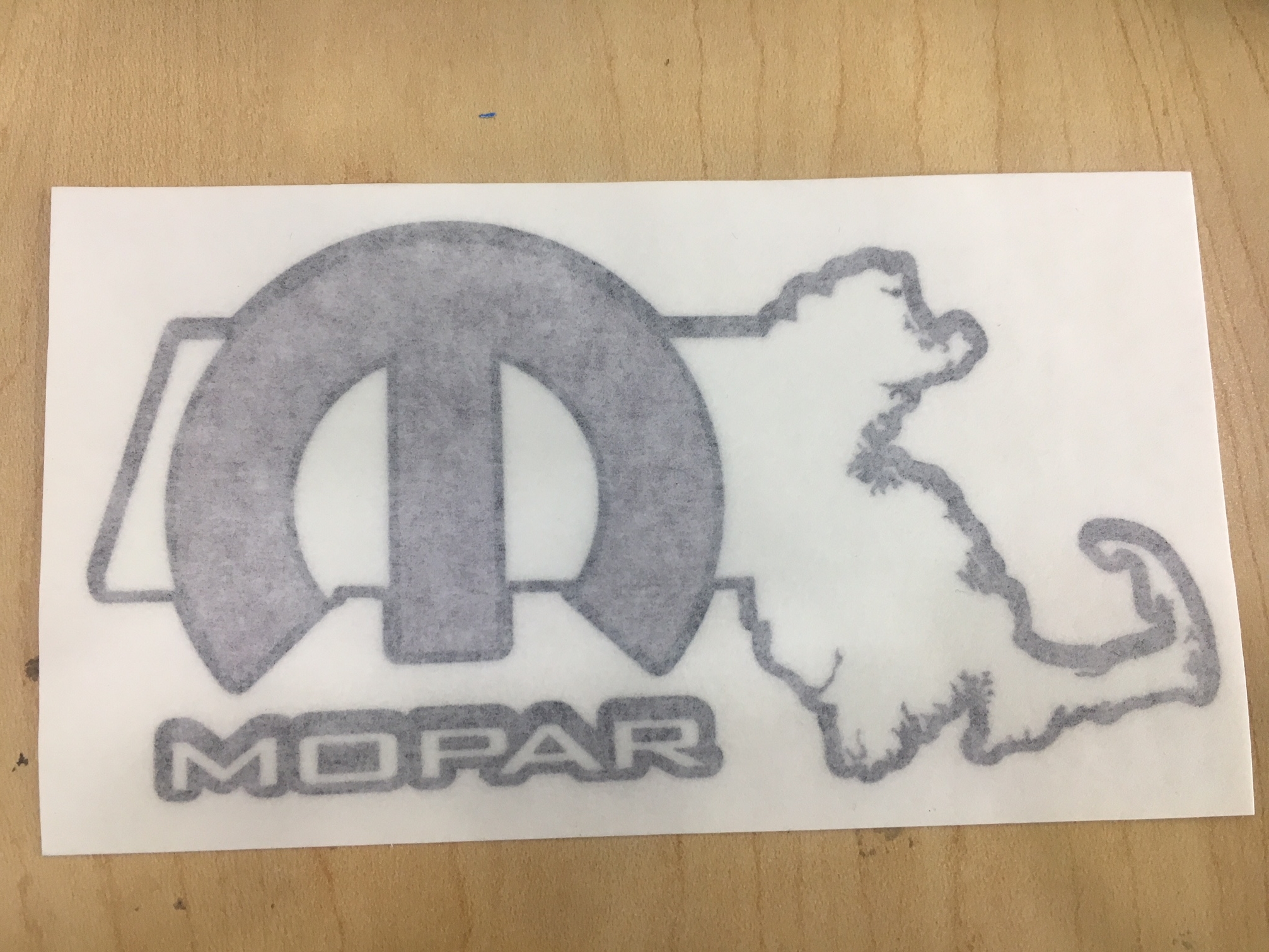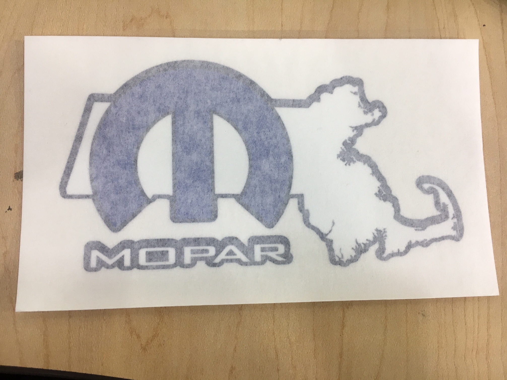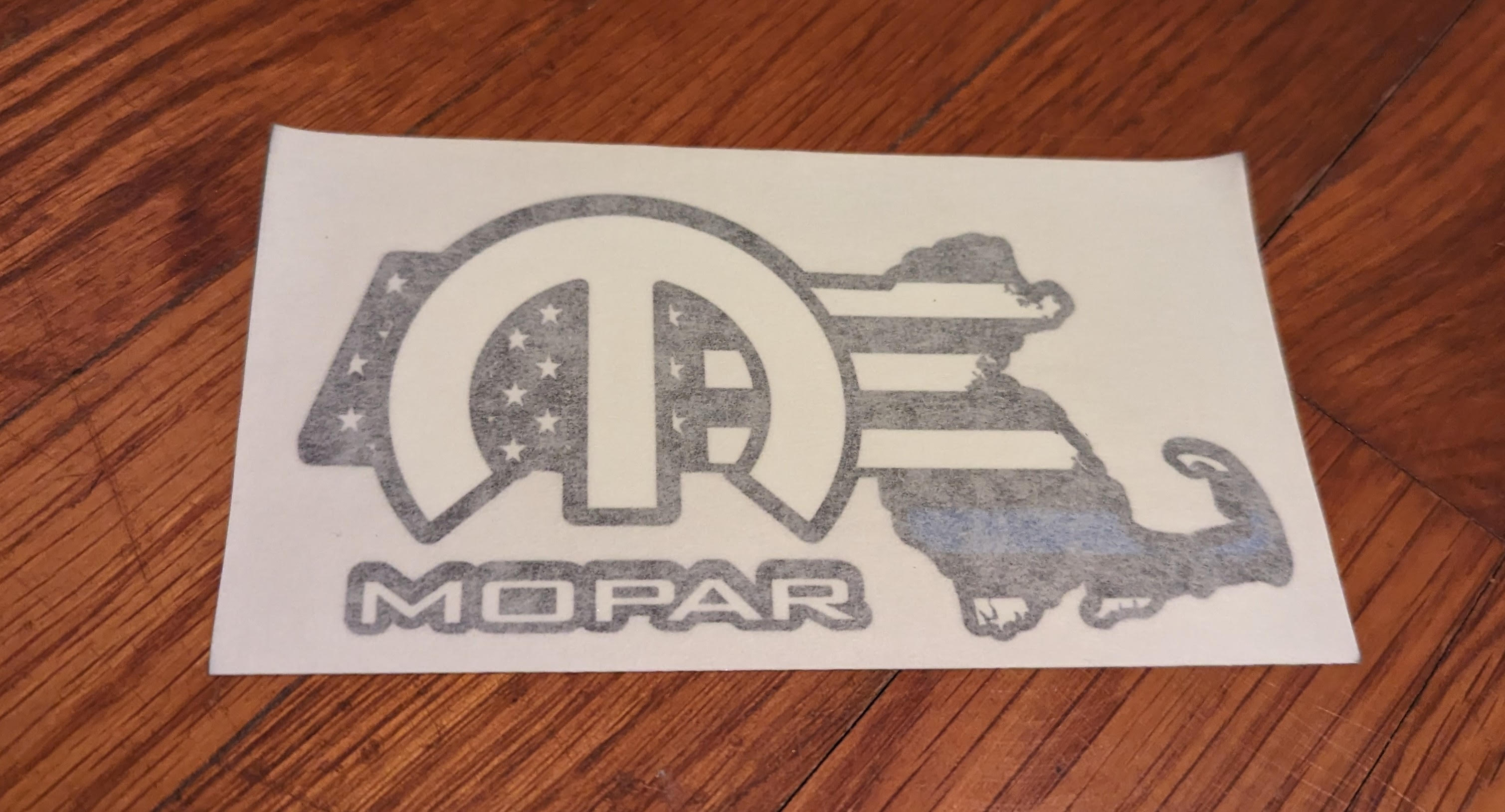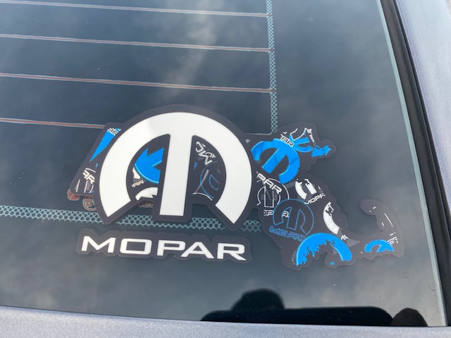 MoM logo – White with Mopar logo pattern background (Logo’s are White, Grey, Black, and Blue) and Black border. 3″ X 5″